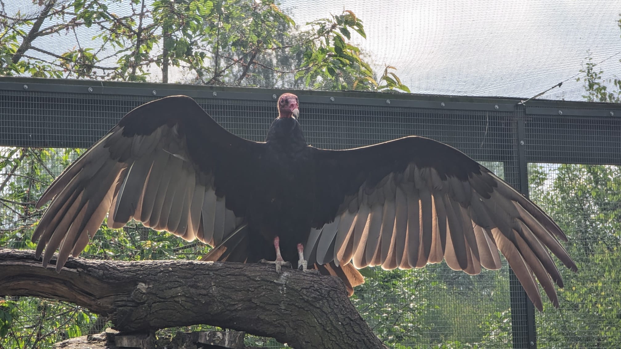 Though they typically spend much of their time solitary, foraging independently or in small groups, during feeding times, large communal roosts are formed, sometimes including several thousand birds. These roosts serve as gathering spots for group foraging and social interaction. Turkey vultures have a unique and rather defensive behaviour: when threatened, they vomit partially digested meat. This acidic, foul-smelling substance is potent enough to deter most predators or unwelcome intruders. In hot weather, they employ a cooling method called "urohydrosis," where they defecate on their legs to lower their body temperature and kill off harmful bacteria they may have picked up from their meals. They also have a habit of spreading their wings in a horaltic stance to dry off or warm up, particularly after damp or rainy nights.